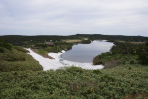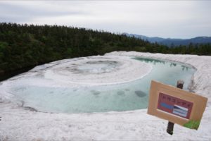 八幡平頂上付近にある鏡沼の雪解けの様子が